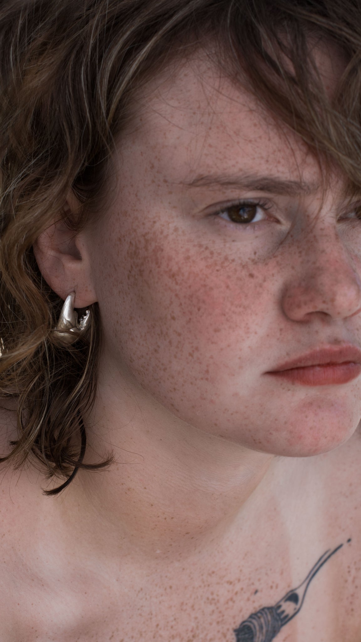design silver organic shaped earring in form of a crab claw on a model